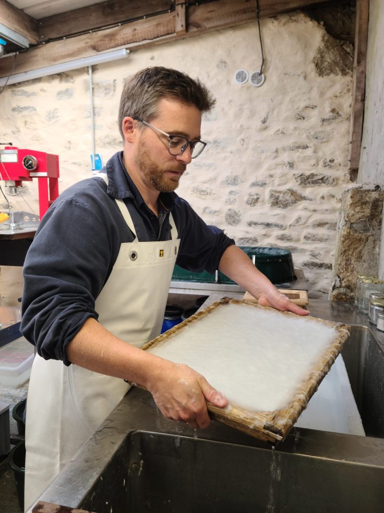J’ai créé l’atelier 5°W PAPIERS en juillet 2024, dédié à la fabrication de papier artisanal, à partir de fibres de lin et chanvre, et de matières locales comme les algues, pour les arts graphiques et la papeterie d’art. Guidé par la lumière et la transparence, je développe également des luminaires à partir de mes papiers de création. Lauréat de l’Académie des Savoir-faire Hermès en 2025 autour du papier, je m’ouvre aux innovations et collaborations avec des designers et autres artisans d’art.